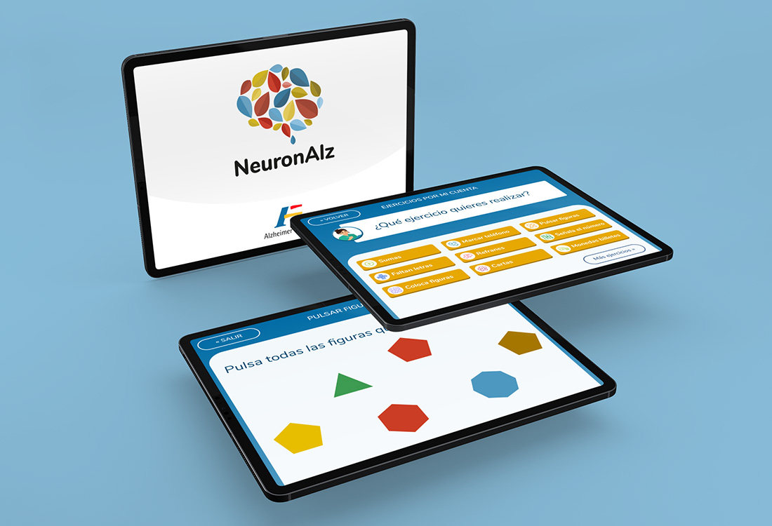 NeuronAlz es una aplicación de estimulación cognitiva para tablets creada para personas con Alzheimer. La app ha sido desarrollada por la Fundación Alzheimer España y la Universidad Politécnica de Madrid. En este proyecto me encargué del diseño de la interfaz de usuario de la aplicación así como de su logo.