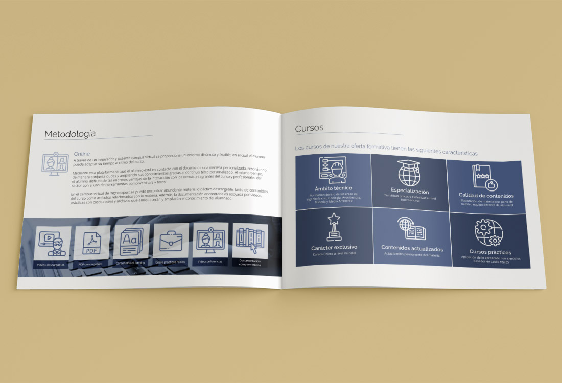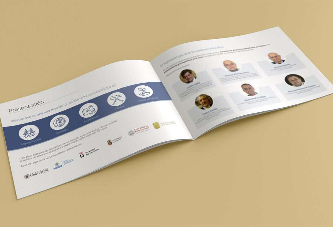 Ingeoexpert es una empresa de formación que imparte cursos de Ingeniería Civil, Arquitectura, Ciencias de la Tierra y Medio Ambiente. Diseñé para ellos el dossier corporativo en el que presentan a sus clientes los servicios y cursos que desarrollan.
