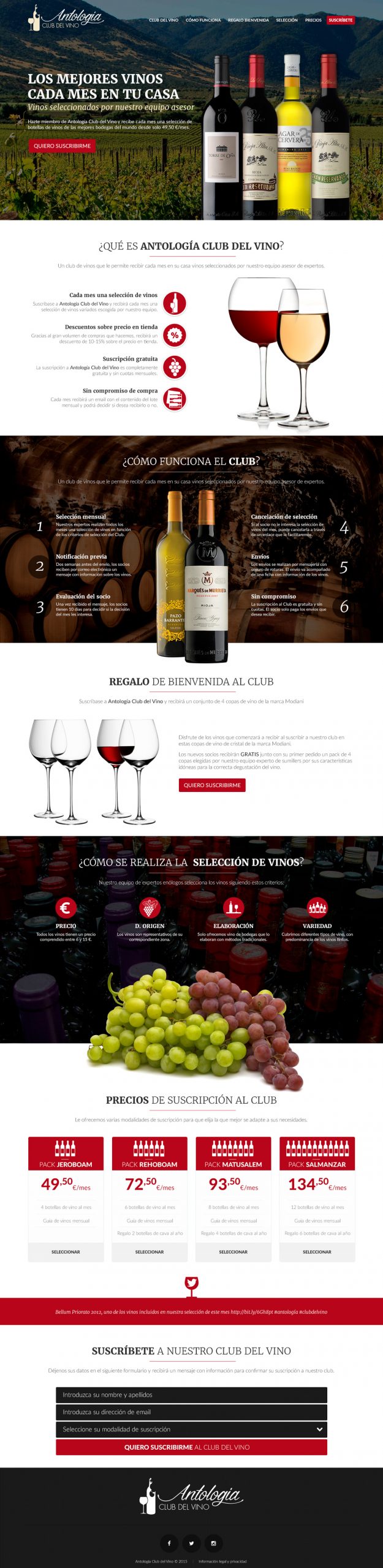 PORTFOLIO Landing Club del Vino EL PROYECTO Antología Club del Vino ofrece a sus socios envíos mensuales de una selección de botellas de vino. Diseñé y desarrollé esta landing para captar nuevos socios que llegaban a la landing a través de una campaña de Google Adwords. FECHA octubre 2016 CATEGORÍA Digital