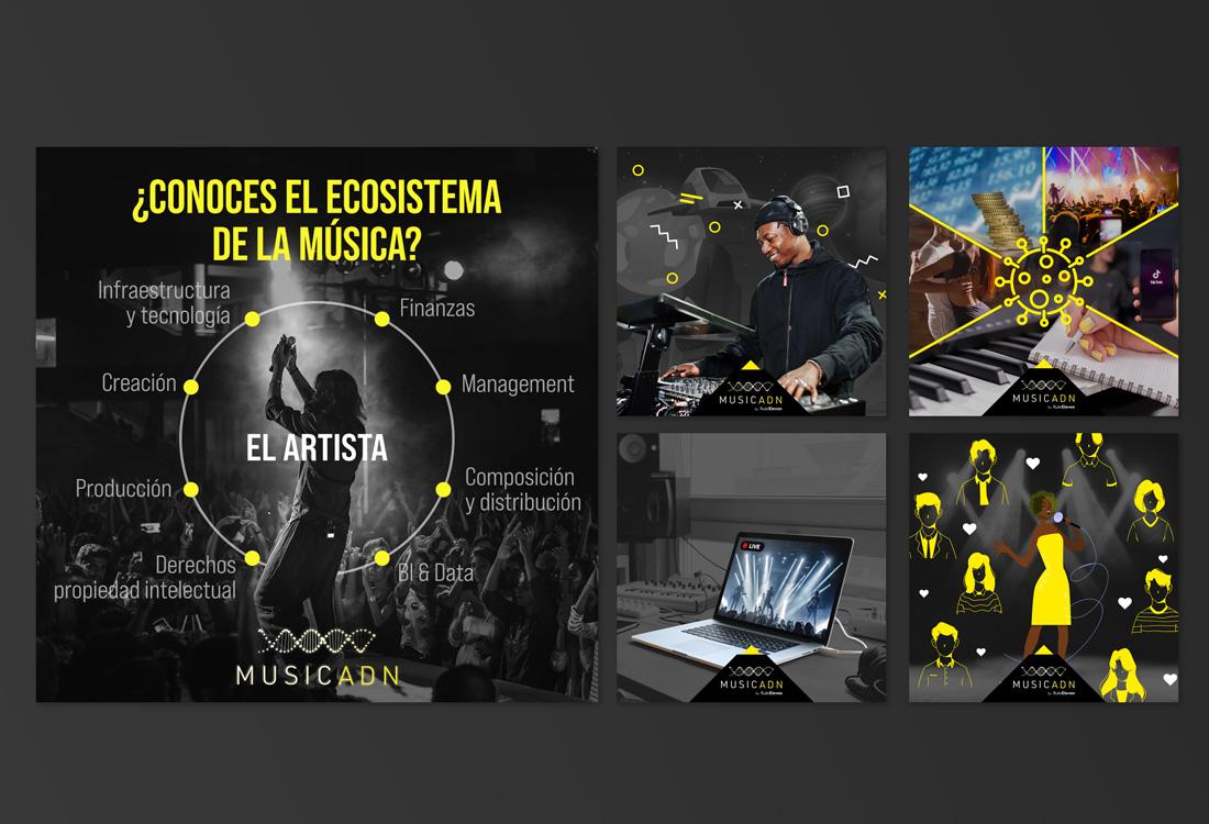 MusicADN es una plataforma que ayuda, mediante contenidos formativos y otras herramientas, a que los artistas puedan desarrollar su carrera musical y empresarial. Diseñé el logotipo de la plataforma así como diferentes creatividades para sus redes sociales.