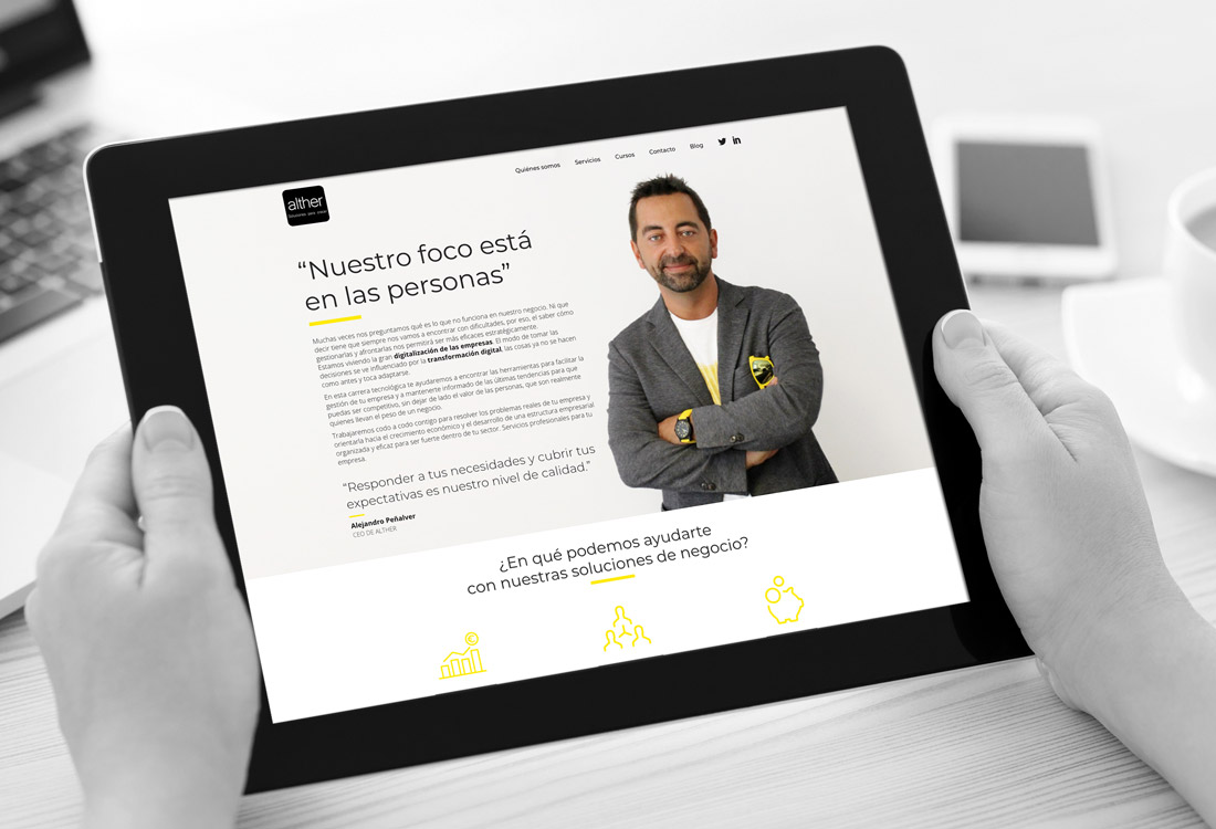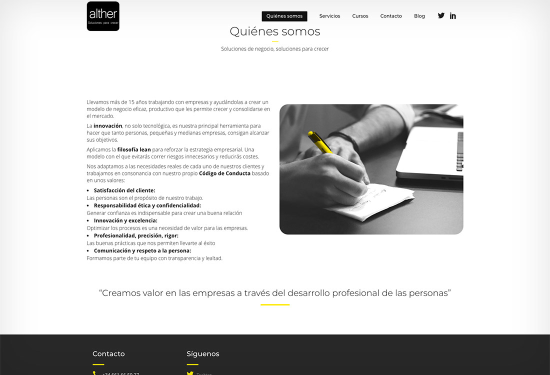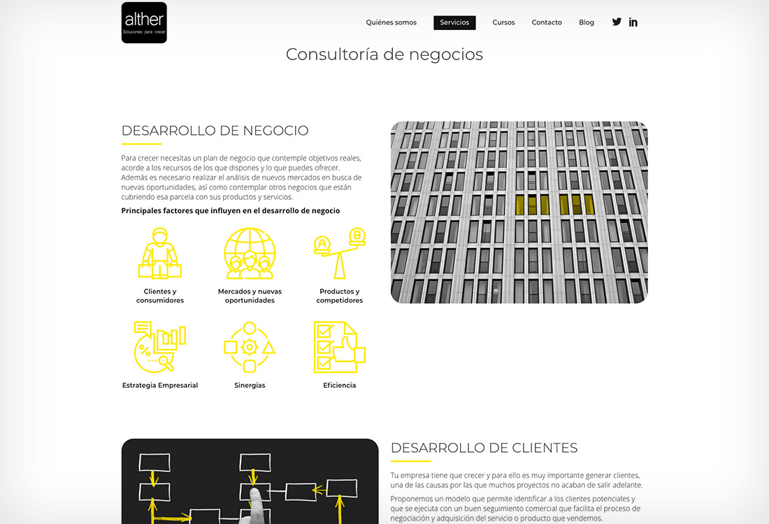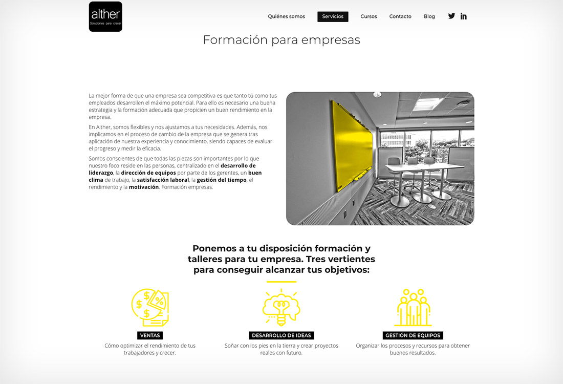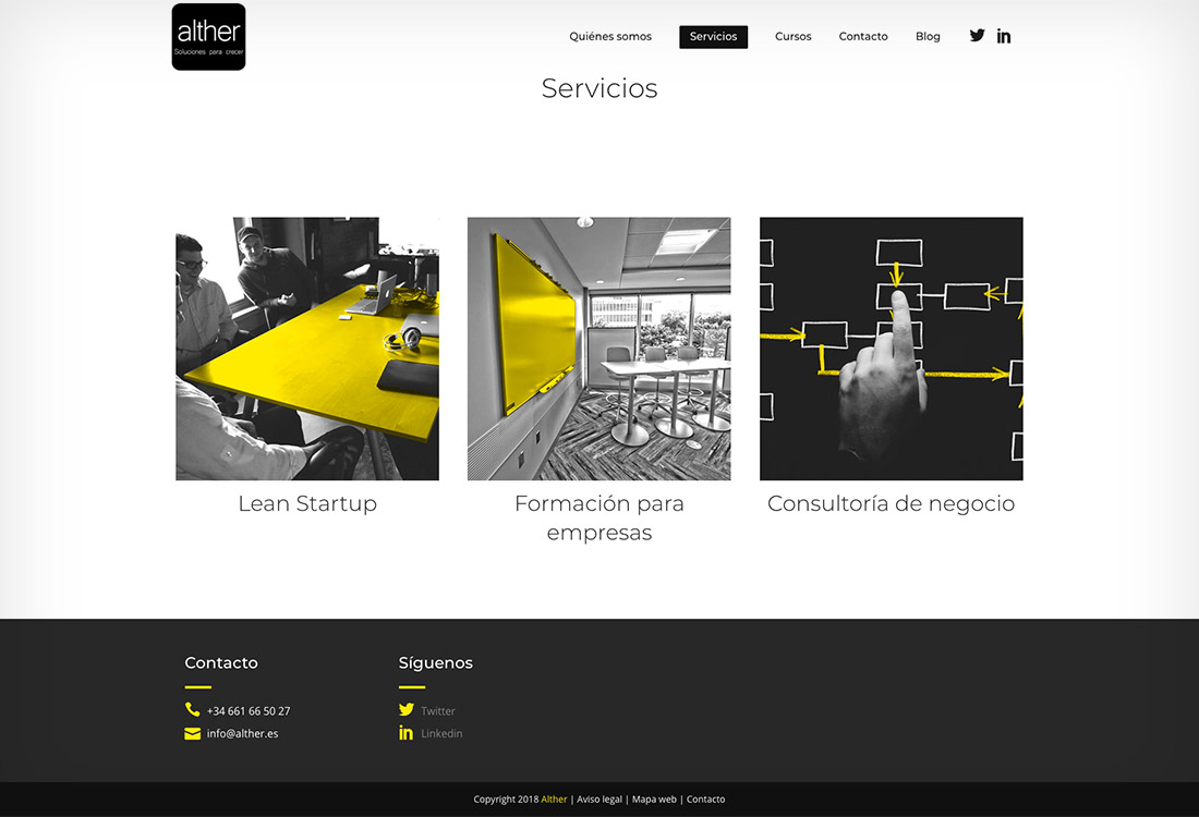 Alther es una empresa que ofrece servicios de consultoría de negocio e imparte cursos de formación para empresas y emprendedores. La web de la empresa, que diseñé y desarrollé, presenta todos estos servicios a sus clientes.