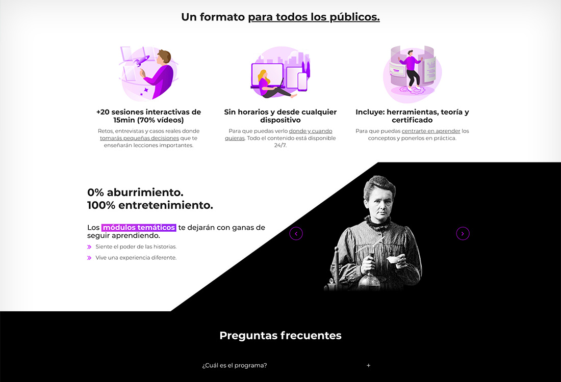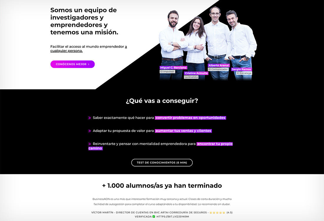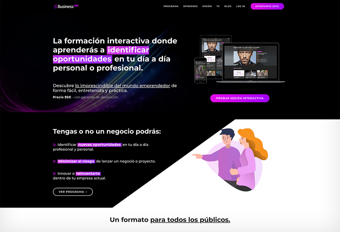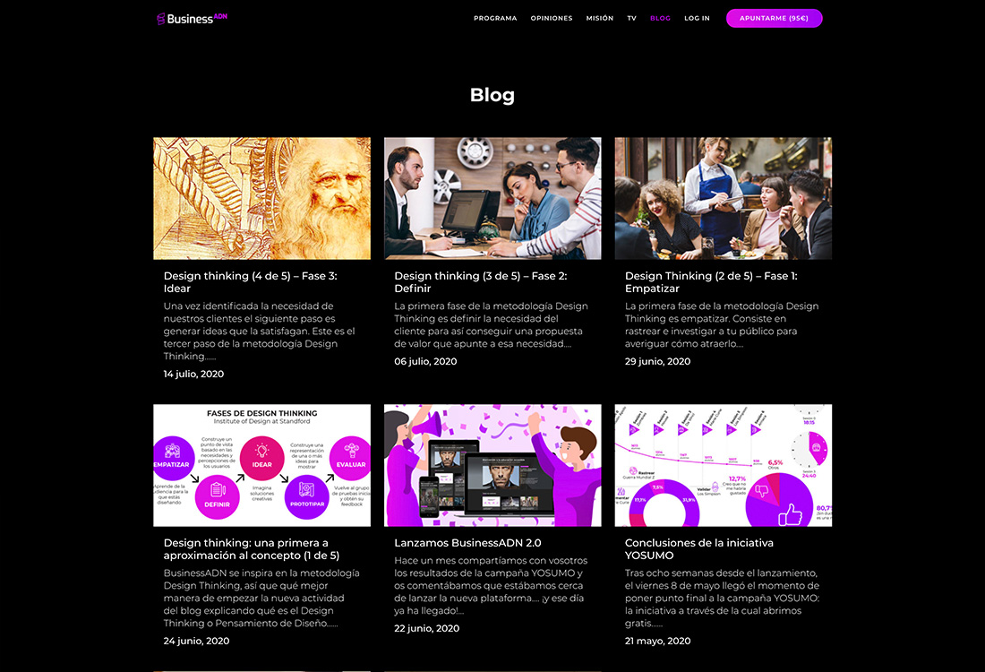 PORTFOLIO Web BusinessADN EL PROYECTO BusinessADN es una formación interactiva para facilitar el acceso al mundo emprendedor a cualquier persona. Diseñé tanto su web, en la que dan a conocer su programa, como el área privada donde se desarrollan las sesiones de la formación. FECHA abril 2020 CATEGORÍA Digital