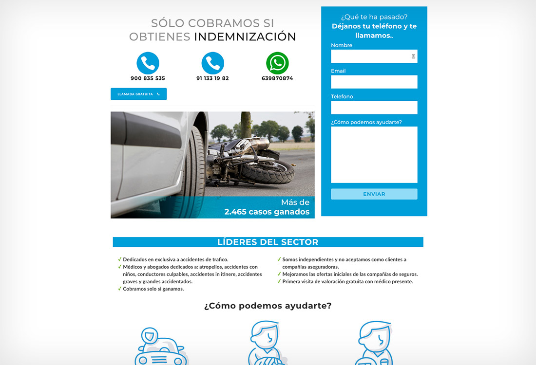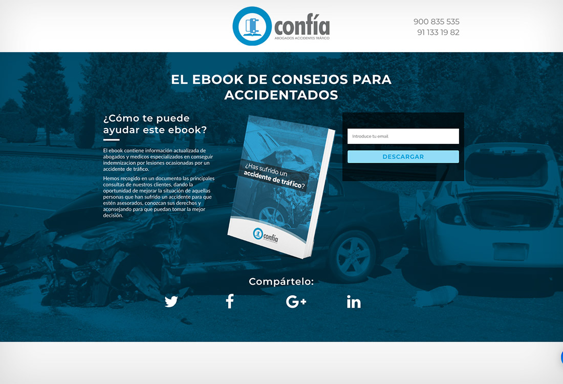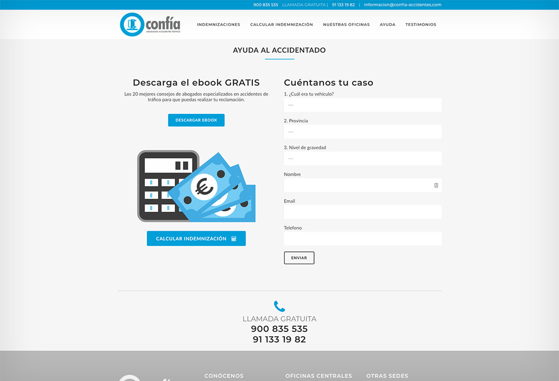 PORTFOLIO Web Confía Accidentes EL PROYECTO Confía Accidentes es un bufete de abogados especializados en accidentes de tráfico. Me encargué del diseño y desarrollo de varias landings informativas a las que los usuarios llegaban a través de anuncios en Google Adwords. FECHA septiembre 2018 CATEGORÍA Digital