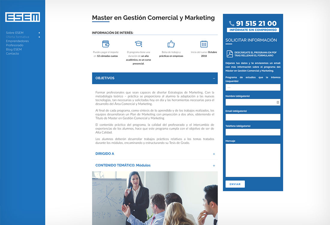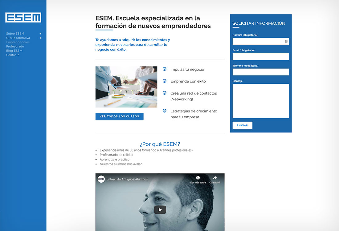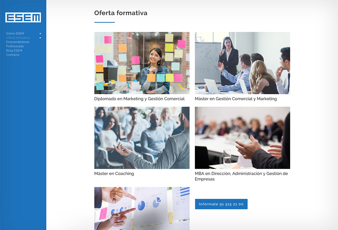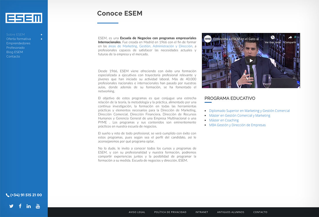 PORTFOLIO Web ESEM EL PROYECTO ESEM, es una escuela de negocios con programas empresariales internacionales y más de 50 años de experiencia. Diseñé y desarrollé su nueva web en la que se ofrece información sobre la escuela y los programas formativos que imparte. FECHA octubre 2017 CATEGORÍA Digital