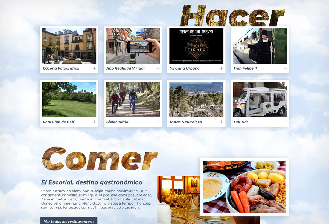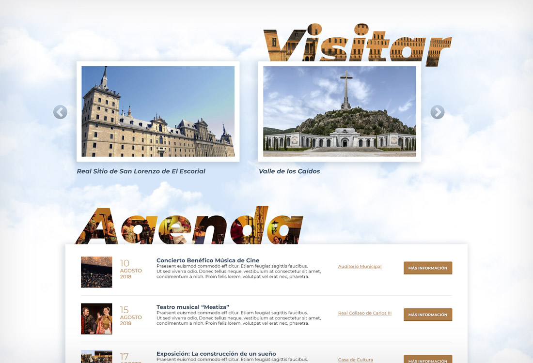 PORTFOLIO Web Turismo San Lorenzo del Escorial EL PROYECTO Turismo de San Lorenzo del Escorial quería una web más moderna y atractiva para promocionar los puntos de interés turístico y los eventos que se celebran en la localidad. Diseñé esta web en la que la agenda gana en protagonismo y contenido. FECHA julio 2018 CATEGORÍA Digital