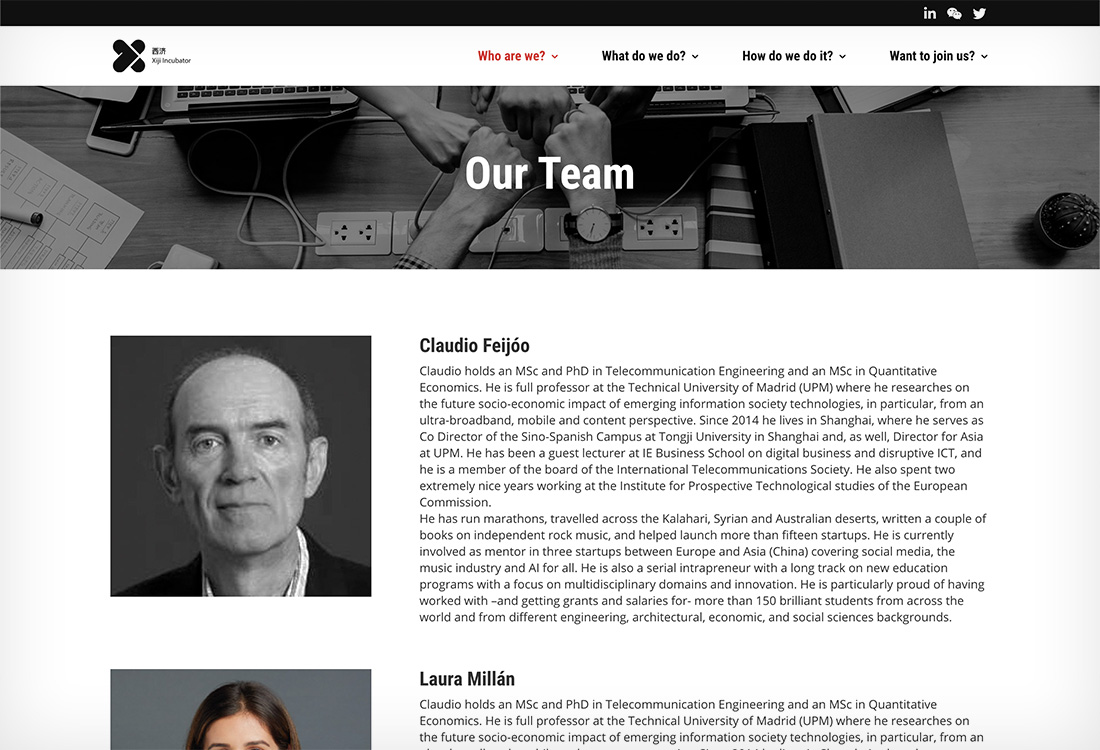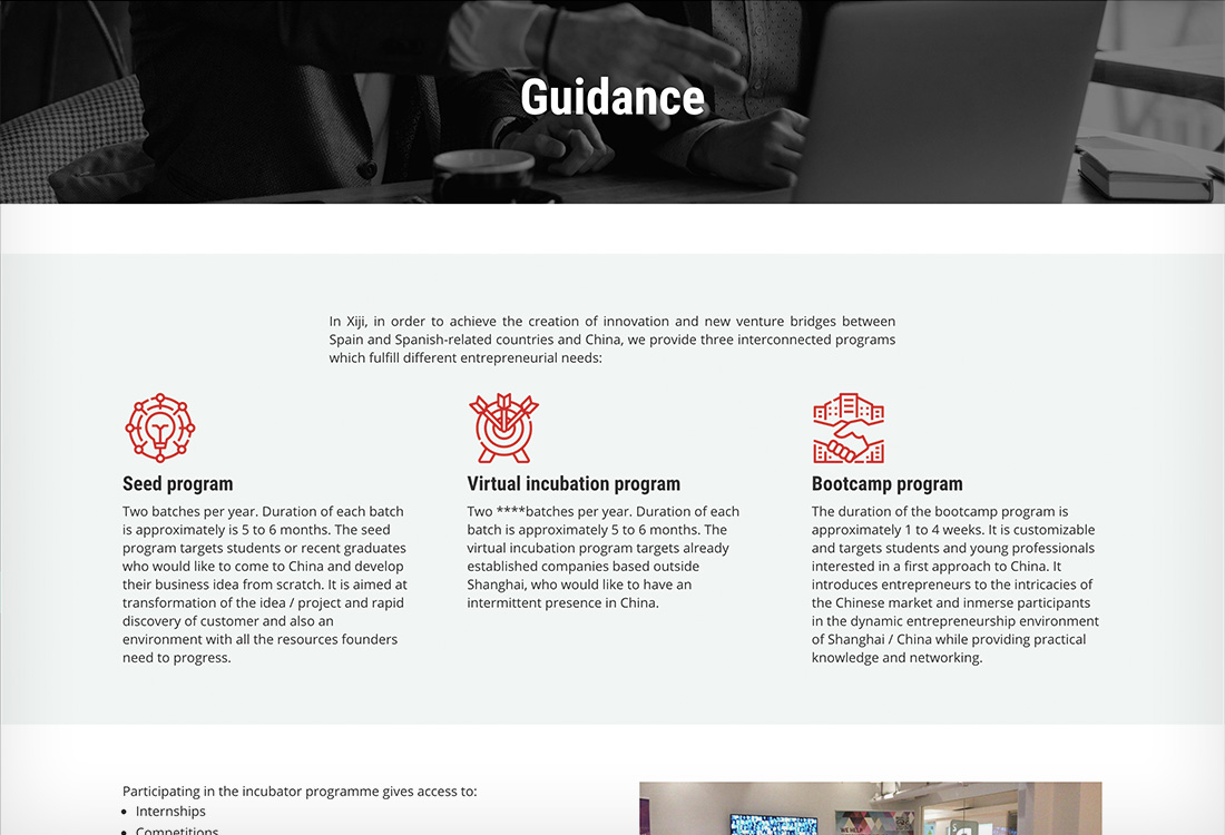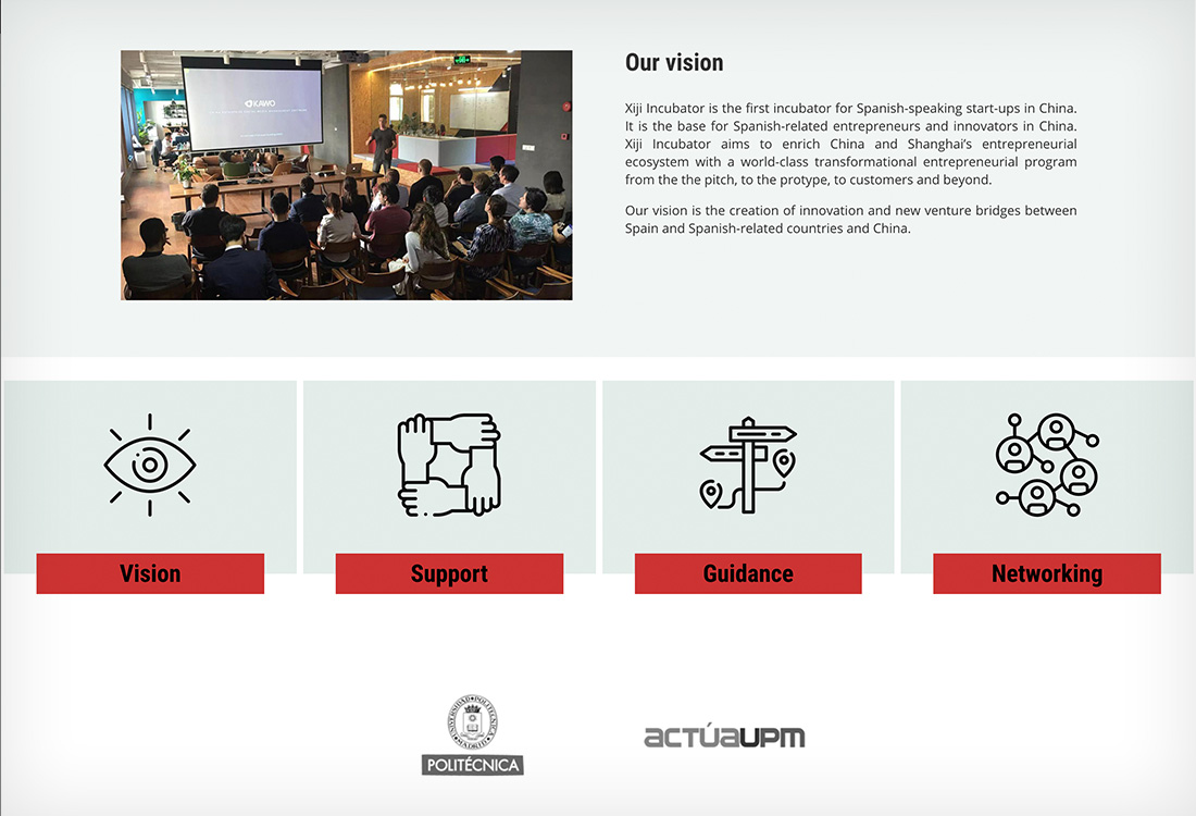 PORTFOLIO Web Xiji Incubator EL PROYECTO Xiji Incubator es una incubadora que ayuda a emprendedores e innovadores españoles a desarrollar sus proyectos de negocio en China. Diseñé y desarrollé su web en la que informan sobre sus programas y actividades. FECHA marzo 2021 CATEGORÍA Digital